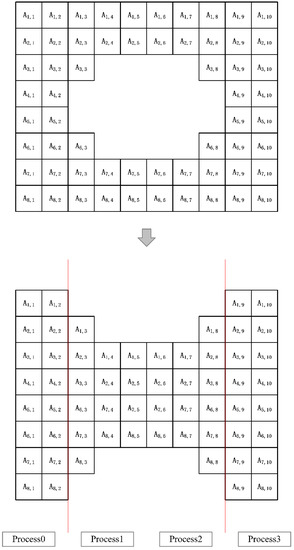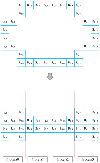 Before giving a specific MPI parallel strategy, it is necessary to understand the MPI parallel algorithm of the standard LBM, especially the data transfer between nodes. Here this paper first introduces the MPI meshing in a two-dimensional case. Distributing the workload evenly to all available processes is essential for good scalability and high performance. The goal is to prevent processes from being idle while waiting for data from other processes. All grid cells in the simulation space are allocated to all available processes so that there are no idle processes during execution. This is the central task of the load-balancing algorithm [28]. In this paper, a similar one-dimensional meshing strategy is used for the meshing phase of the numerical simulation parallel test, which is shown in Figure 6.