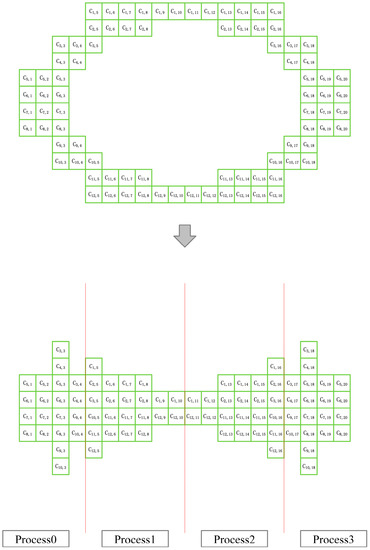 Although the standard LBM has good scalability, the discrete velocity of its particles determines the type of computational grid, i.e., the “lattice” type. In general, this grid has a regular geometry. However, in the calculation, the grid, although simple, lacks flexibility and is difficult to apply to irregular flow fields. The physical quantity of the area changes drastically, and the spatial and temporal gradients are large. Therefore, in this case, it is often necessary to use a local grid-refinement method. The mesh refinement affects the parallelism of the original method. It is necessary to conduct an analysis and design a highly scalable parallel algorithm with load balancing. Load balancing is of great importance in high-performance parallel programming. Load-balanced task allocation is the basis for achieving the highest operational efficiency. In this paper, a static load-balancing scheme is used to construct a parallel algorithm for the multilayer grid LBM. The scheme relies on the grid partitioning scheme shown in Figure 6 to allocate as much load balance as possible for the cluster system in terms of grid computation and memory occupation to achieve shorter running time.