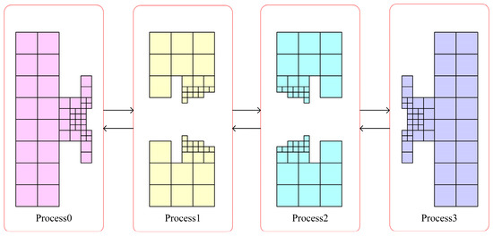 According to the grid-division method described above, the grid from the first layer to the third layer is basically evenly divided into 4 equal parts. Each MPI process can be responsible for a part of each layer of the grid. The algorithm defines the process numbers of the four MPI processes as 0, 1, 2 and 3. Then, the computational grid responsible for a single process of these four MPI processes is shown in Figure 12.