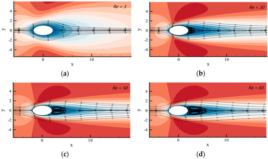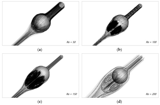 Streamlines of the flow field of a three-dimensional sphere at different Reynolds numbers. (a) Re = 50; (b) Re = 100; (c) Re = 150 and (d) Re = 200.