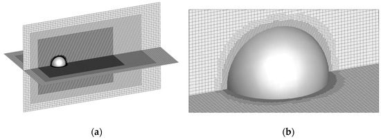 (a) shows the multi-layer grid structure of the sphere around the flow in 3D, with the global grid structure of the computational domain and (b) displays the local grid refinement around the boundary of the spherical rigid body on the right.