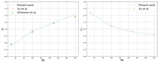 Four sets of steady axisymmetric flow simulations with different low Reynolds numbers were carried out, and the Reynolds number was defined as: . Figure 20 shows the streamline diagram of the flow-pass sphere in the 3D flow field. For the details of the flow geometry and mechanical properties, the length of the recirculation region and the drag coefficient were selected to compare the simulation results with the previous results of A. Gilmanov et al. [53] and Lei Xu et al. [54] who adopted a general reconstruction algorithm with complex 3D immersed boundaries on Cartesian grids and a scalable parallel unstructured finite-volume LBM, respectively (see Figure 21). It can be concluded that as the Reynolds number increased, the recirculation region volume became larger, and the drag coefficient decreased. Extending to numerical tools for solving various fluid flow and heat transfer systems, the parallel scheme was expected to provide high performance in handling simulation scenarios including nanofluids, energy storage devices, as well as systems with electro-thermo convection. The drag coefficient is defined as: