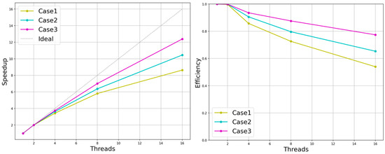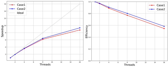 To test the strong scalability performance, a three-dimensional sphere-bypassing benchmark test with multiple levels of cubic Cartesian grids was used. Since the static fine grid structure in this paper was mostly determined by user-defined behavior, the hierarchy and geometry of the computational domain grid varied widely. This paper intended to explore the impact of grid structure variation on the parallel performance of the multi-layer grid LBM in the process of the strong scalability performance evaluation test. Here, the validation experiment’s 3D sphere-bypassing benchmark test grid structure was adopted, which consisted of two levels of the sphere boundary refinement grid area and three layers of the enclosing box refinement grid area (case1). Meanwhile, in the evaluation phase, the experimental design removed the outermost coarse grid of the computational domain space for an experimental object (case2). The size of the global computational space was thus reduced, though with the loss of approximately 122,880 coarse meshes. The experiments were still set with the same boundary conditions as the original ones to simulate the experiments, because the evaluation of the parallel performance could temporarily ignore the results of the simulated experiments. The computational resources for the serial environment as well as the parallel environment with 2,4,8 and 16 threads were given in this experiment. Figure 23 shows the speed-up ratio and efficiency of the parallel algorithm proposed in the article in the two computational domain structures. In both experimental groups, excluding the outermost coarse mesh enclosing the box in one group, the other evolutionary iterative steps were basically the same in the remaining mesh structure. It can be understood that the parallel evolution process of case1 only had more collision, migration and interpolation of the outermost grid and the necessary communication in parallel than that of case2. It can be observed from Figure 23 that the outermost grid increment of 122,880 slightly improved the parallel efficiency. This led to the tentative conclusion that as the grid quantity and grid hierarchy complexity rose, so did the scalability performance of the parallel algorithm based on the load balancing proposed in this research. In the actual simulation scenario, the user needs to select a certain area within the fixed computational domain for local mesh refinement (refinements can be selected in multiple scopes, with each refinement generating a new refinement grid level) instead of adding or subtracting the outermost grid region from the existing grid multilayer structure. Following this process, the overall mesh size and mesh structure complexity increased simultaneously for each selected range of local mesh refinement methods within a certain range. Then, whether the parallel efficiency will increase accordingly. The conclusion will be given in the later experiments.