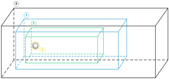 where represents the distribution function from the coarse grid to the fine grid through time and space interpolation. is the time increment ratio between adjacent coarse grids and fine grids. The bar symbol indicates the need for spatial interpolation [49]. The design of the LBM process designed in this paper applying the grid-refinement method is shown in the Figure 4. Its evolution process within one time iteration step uses a loop structure instead of a recursive structure for the programming scheme. Figure 5 shows the evolution of the DC method for the three-layer grid LBM. The code implementation of a multi-layer grid LBM can be based on a geometric subdivision hierarchy of computational domains [41,50]. This structure facilitates the implementation of parallel computing. Based on the experimental content of this study, the hierarchy can be divided from bottom up into the following elements [51]: