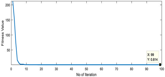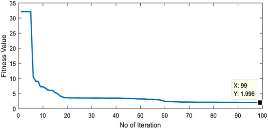 In this case study, 65 series linked cells Nedstack PS6 PEMFC are considered for analysis. The main characteristics of the stack are taken from different literature and compared with different algorithms. The rated current and power of the stack is 225 A and 6 kW, respectively. The LSA is applied to the objective function, and the optimal parameters are listed in Table 5. The convergence characteristic of the fitness function for the PEMFC stack is illustrated in Figure 6. The convergence curve steadily reduces and reaches a steady value with 100 iterations. The value of the best fitness function is found to be 1.996, as mentioned in Table 5. It is worth noting that the proposed LSA achieves a lower SSE than that obtained using other optimization algorithms, such as the neural network algorithm and the salp swarm optimization algorithm [58]. The polarization characteristics of the proposed LSA-PEMFC model, such as I/V and I/P curves, are plotted in Figure 7a,b, where these curves are compared with their measured data. It can be noted that these simulation responses are very close to the experimental responses meaning that the proposed PEMFC model is accurate. Figure 7c,d show the current–voltage characteristics under variable fuel cell temperature and pressure, respectively. It can be realized that the results lie in an acceptable range. As observed from this figure, with an increase in temperature and pressure, the terminal voltage and power increase.