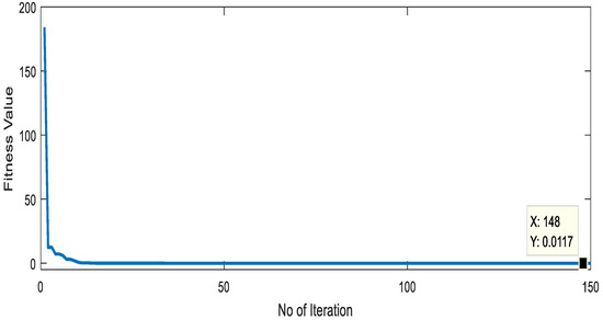 In this case study, a 32 cell connected BCS 500 W PEMFC is analyzed. The feature of the stack is found in other literature. The rated current of the stack is 30 A. To search the best seven unknown parameter values, the LSA is applied, and after several runs, the best-suited parameters are found and mentioned in Table 4. The convergence characteristic of the fitness function for the PEMFC stack is illustrated in Figure 4. As seen in Figure 4, the convergence curve steadily reduces and reaches a steady value with 100 iterations. The value of the best fitness function is found to be 0.01169, as mentioned in Table 4. It is worth noting that the proposed LSA achieves a lower SSE than that obtained using the neural network algorithm and salp swarm optimization algorithm [58]. The polarization characteristics of the proposed LSA-PEMFC model, such as I/V and I/P curves, are plotted in Figure 5a,b, where these curves are compared with their measured data. It can be noted that these simulation responses are very close to the experimental responses meaning that the proposed PEMFC model is accurate. Figure 5c shows the current-voltage characteristics under variations of fuel cell temperature. The partial pressure is assumed constant. It can be realized that the results lie in an acceptable range.
