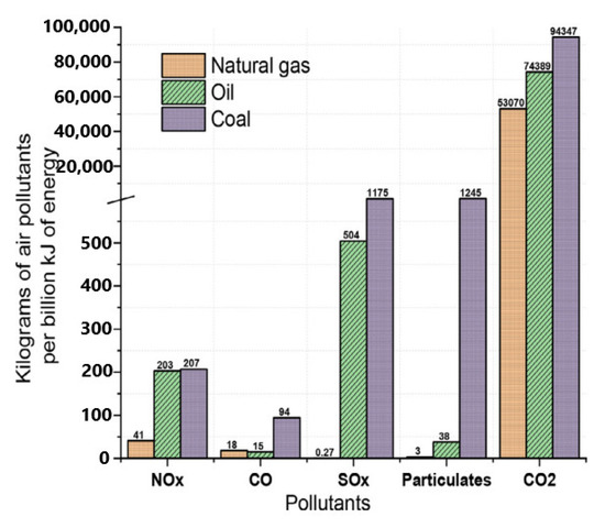 Energy demand is observably increasing due to many factors, including the population growth and the improvement of living standards. Global energy consumption is estimated to increase by about one-third by 2040, with fossil fuels being the main source of energy [1,2]. However, the combustion of such fuels will contribute to a great deal of greenhouse gas (GHG) emissions, especially a large amount of carbon dioxide (CO2) emissions. Compared with oil and coal, natural gas (NG) reduces CO2 emissions per unit of energy by approximately 29%–44% [3], In addition, natural gas is commonly described to be a bridge fuel for future renewable energy, primarily for its lower air pollutant emissions, as shown in Figure 1 [4]. It is considered to be the among the cleanest fossil fuels and has become an attractive energy [3]. Therefore, the contribution of NG to the total demand of the world’s primary energy has increased significantly, providing nearly 24% of the world’s energy [5,6].