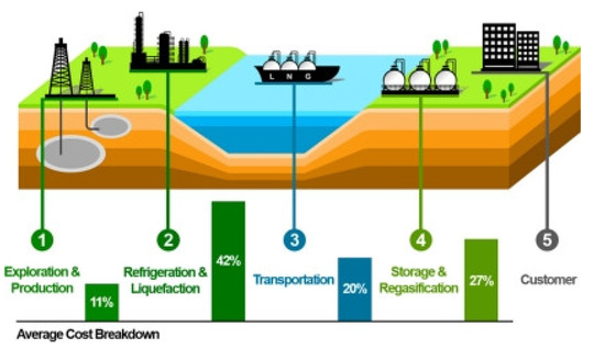 LNG value chain and the cost breakdown [14]. Reprinted (adapted) with permission from {Lee, I.; Park, J.; Moon, I. Key Issues and Challenges on the Liquefied Natural Gas Value Chain: A Review from the Process Systems Engineering Point of View. Ind. Eng. Chem. Res. 2018, 57, 5805–5818. https://doi.org/10.1021/acs.iecr.7b03899.}. Copyright {2018} American Chemical Society.