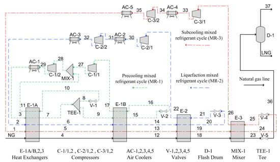 Although the refrigerant ratio does not need to be considered in cascade liquefaction process with pure component refrigerant, the process has strict requirements on the refrigerant purity. The purity (volume fraction) of ethylene and propane should be at least 99% [38]. In addition, the process is not suitable for NG liquefaction systems with more nitrogen, so it is less used now. Since the 1990s, cascade liquefaction processes with mixed refrigerants have become more complete and are able to be cascaded more efficiently than pure component refrigerant under the same stage number. In 2006, a mixed fluid cascade (MFC) process developed by Linde and Statoil was successfully implemented at the Snohvit LNG project in Norway [39]. This process used three mixed refrigerants to replace three pure component refrigerants for providing cooling capacity in pre-cooling, liquefaction and sub-cooling cycles. Although the MFC process is complex, compared with other NG liquefaction processes, it has higher thermodynamic efficiency, lower energy consumption, and higher exergy efficiency [40]. A typical MFC process is shown in Figure 7 [39]. Here, two multi-stream heat exchangers were used, one for pre-cooling of the feed gas and the other for liquefaction and sub-cooling of the second and third cycles.
