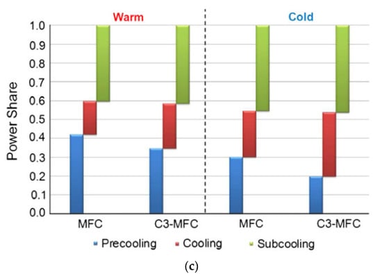 Specific work and power share of studied cases: (a) Design variable for the MFC and C3-MFC processes in warm climate. (b) Design variable for the MFC and C3-MFC processes in cold climate. (c) Power share for the MFC and C3-MFC cases in warm and cold climates [45]. Reproduced with permission from Elsevier (license number 5413340359652).