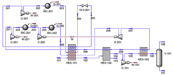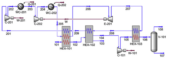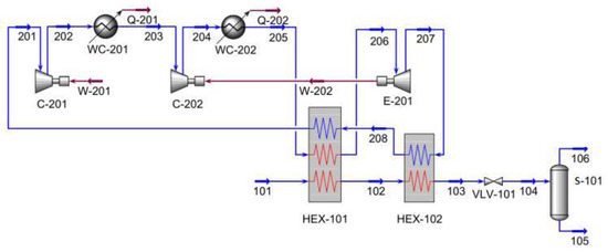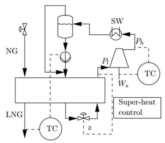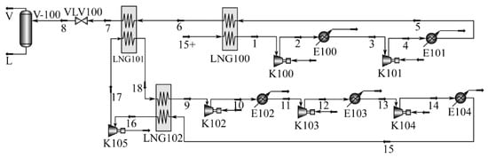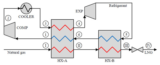 The proposed N2O-N2O-N2 cycle for natural gas liquefaction [37]. Reprinted (adapted) with permission from {Lee, C.-J.; Song, K.; Shin, S.; Lim, Y.; Han, C. Process design for the offshore production of liquefied natural gas with non-flammable refrigerants. Ind. Eng. Chem. Res. 2015, 54, 11106–11112. https://doi.org/10.1021/acs.iecr.5b01620.}. Copyright {2015} American Chemical Society.