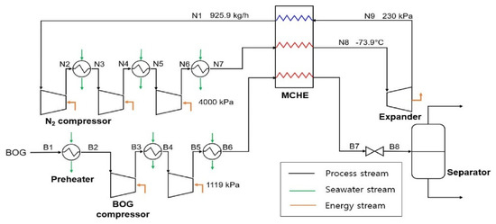 Process flow for boil-off gas (BOG) re-liquefaction nitrogen expansion liquefaction process [57]. Reproduced with permission from Elsevier (license number 5413360697553).