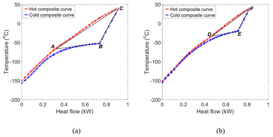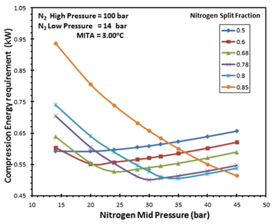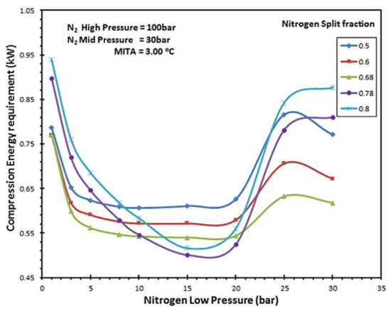 The pressure ratio of refrigerant in single nitrogen expansion cycle is given according to the temperature drop required before and after the expander. Since all refrigerants need to be expanded at the expander at once for a minimum temperature, the refrigerant pressure ratio increases, resulting in a considerable rise in the irreversibility of the heat exchanger and an increased compression energy requirement. This is the reason for a higher than the desired setting of the heat transfer temperature difference and the heat transfer drive. Such irreversibility is expressed in the form of clearance between the hot and cold composite curves [57]. In single nitrogen expansion cycle, irreversible loss increases with the decrease of the overall operating pressure, and a higher nitrogen flow rate will increase the irreversibility and compression work of the process. To reduce power consumption, the optimal design shall shift towards lower refrigerant flow rates and higher pressure ratios in order to find the optimum nitrogen flow rate for the working differential pressure [53,57].
