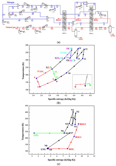 (a) The diagram of the parallel nitrogen expansion liquefaction process (PNEC); (b) Temperature-Entropy diagram of parallel nitrogen expansion liquefaction process; (c) Temperature-Entropy diagram of natural gas [61]. Reproduced with permission from Elsevier (license number 5413370329012).