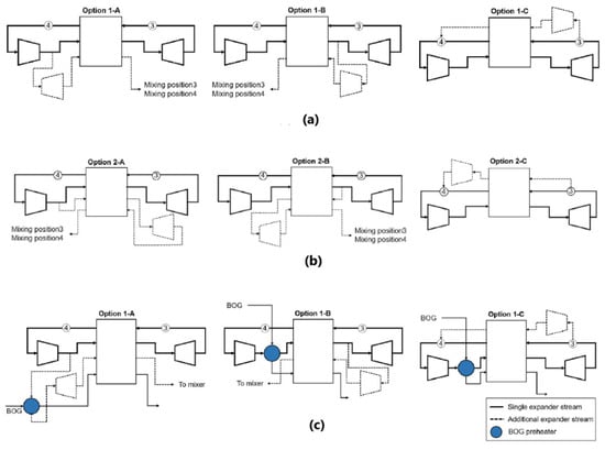 Design options considered for the structural optimization of dual expander systems: (a) Option 1; (b) Option 2; (c) Heat exchange of BOG preheater [55]. Reproduced with permission from Elsevier (license number 5413360219443).