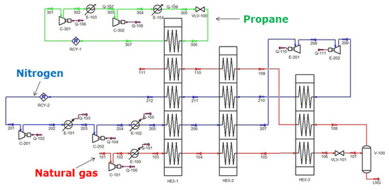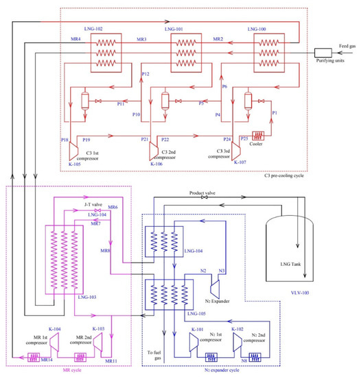 Adding a pre-cooling cycle to the expansion cycle is an efficacious way of increasing the energy efficiency of the nitrogen expander liquefaction process [64,65]. Nitrogen expander liquefaction process with pre-cooling adopts two independent refrigerant cycles as shown in Figure 21. Propane is used for pre-cooling after compression and cooling, and the nitrogen expansion cycle is used for NG cooling and sub-cooling. The propane pre-cooling cycle can pre-cool NG at a lower evaporation temperature and relatively low pressure, thus reducing nitrogen liquefaction and sub-cooling load. This results in a reduced flow of nitrogen in the main cooling cycle, thereby reducing the energy consumption of nitrogen compressor and improving the liquefaction capacity throughout the process [66,67,68].