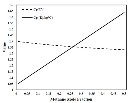 The variation of Cp and Cp/Cv in different mole fractions of methane in the mixed refrigerant at standard conditions [92]. Reproduced with permission from Elsevier (license number 5413460001026).