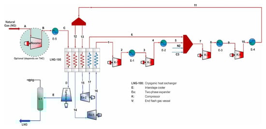 Process flow for boil-off gas (BOG) re-liquefaction nitrogen expansion liquefaction process [55]. Reproduced with permission from Elsevier (license number 5413360219443).