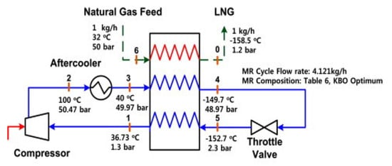 - Cao, W.; Wu, J.; Lu, X.; Lin, W.; Gu, A. Thermodynamic analysis on mixed refrigerant cycle of small scale natural gas liquefaction process in skid-mounted package. J. Chem. Ind. Eng. 2008, 59, 53–59. [Google Scholar]