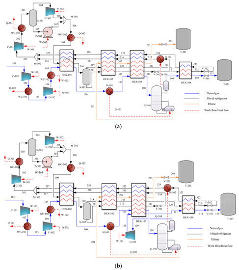 - He, T.; Lin, W. Design and optimization of integrated single mixed refrigerant processes for coproduction of LNG and high-purity ethane. Int. J. Refrig. 2020, 119, 216–226. [Google Scholar] [CrossRef]