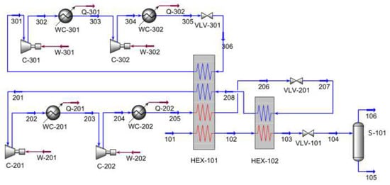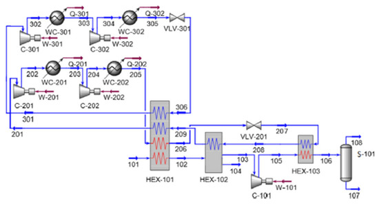 Conventional cascade liquefaction process uses hydrocarbons as refrigerants. Hydrocarbons have zero ozone depletion potential and sufficient cooling capacity. However, they are prone to safety problems due to their flammability [32]. On a special note, for instance, FLNG require the considerable minimization of combustibles inventory. With the increasing demand for inhalation safety and small storage tanks, there are more and more studies on the liquefaction process of refrigerants containing non-combustible substances [33]. Nitrogen is the most frequently used refrigerant. The typical approach is to combine nitrogen with hydrocarbon refrigerants [34] or non-combustible oxides [35,36,37], such as N2O and CO2. In the trans-critical cycle, the temperature slip of CO2 above the critical point can better match the temperature slip of heat source. However, if the working range is limited to the subcritical region, N2O is more suitable for being utilized as working fluid in condenser. A cascade process of N2O-N2O-N2 refrigerants is shown in Figure 6 [37]. In this process, both the pre-cooling section and the condensation section use N2O cycles, and the sub-cooling section uses N2 refrigerant. Compared with the conventional cascade liquefaction process with hydrocarbons, N2 refrigerant with the lowest temperature only circulates to the former refrigeration cycle of condensation unit, while the methane refrigerant needs to return to the pre-cooling unit in the conventional process.