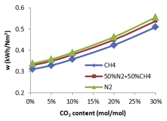 At standard conditions, the specific heat (Cp) at a constant pressure of methane is about twice that of nitrogen (2.236 kJ/kg °C for methane and 1.041 kJ/kg °C for nitrogen). Mixing methane with nitrogen will directly change the properties of new refrigerant. Methane with a higher boiling point is beneficial for meeting the demand of liquefaction rate with lower energy consumption, while giving play to the higher specific refrigeration effect of methane and the advantage that nitrogen is easy to cool down due to its lower expansion rate [85]. Figure 24 shows the variation of Cp and Cp/Cv under different methane mole fractions in N2-CH4 mixed refrigerant. With the increase of methane concentration, the Cp of mixed refrigerant increases and the specific heat ratio (k = Cp/Cv) decreases. The use of optimized refrigerant ratios over a certain pressure and temperature scale helps to decrease energy consumption during the expansion liquefaction process [86,87,88]. Cao et al. [89] analyzed two typically liquefaction processes in a small LNG plant and found that the N2-CH4 expander cycle took precedence over the mixed refrigerant liquefaction cycle in the absence of propane pre-cooling. Moein et al. [87] investigated the effect of methane addition on the nitrogen expander cycle and showed that when the concentration of methane in the mixed refrigerant was 26 ± 1%, the network required by the liquefaction process is the minimum, as there is an 8% reduction as compared to the liquefaction process with pure nitrogen. Ding et al. [90] studied the changing trend of specific power consumption under different proportions of refrigerants N2 and CH4. It was shown that with the increase of N2 content, the specific power consumption first decreased and then increased, where the higher the liquefaction rate, the larger the proportion of N2 in the optimal refrigerant ratio. After the composition optimization of expander liquefaction process with propane pre-cooling, compared with conventional nitrogen expander liquefaction process, 22.7% power consumption could be saved. Moreover, it saves 4.06% power consumption compared to nitrogen expander process with propane pre-cooling. He et al. [91] designed N2-CH4 expander liquefaction process with propane pre-cooling that also took ethane recovery into account by adding ethane separation and distillation module, as shown in Figure 25, and compared it with a similar dual nitrogen expander liquefaction process and dual nitrogen expander liquefaction process with propane pre-cooling. The results indicated this process had the highest (fire use) efficiency, the least specific energy consumption, the best suitability for the ethane content of the feed gas, and an ethane recovery rate higher than 99.5%.