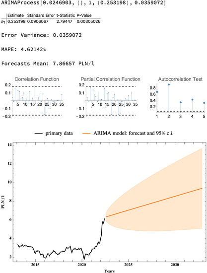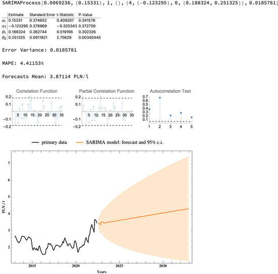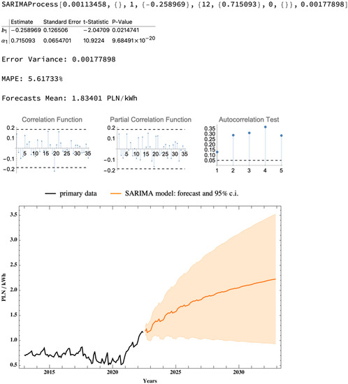 Average and maximum prices for the 2013–2022 period are included the descriptive statistics in Table 3. The average prices for the 2022–2032 period were determined using the Seasonal Autoregressive Integrated Moving Average (SARIMA) method, an effective technique for modelling and forecasting time series. The technique allows to include both autoregressive, moving average, seasonality, and non-stationarity effects in a single model [57,58,59]. SARIMA models have been used to forecast fuel and energy prices [60,61,62,63,64] and, therefore, this method was also applied in the current study. Prices of electricity, LPG, and heating oil rapidly ascended towards the end of the studied period. Initially prices increased at the beginning of 2021 and the price increase in 2022 has been attributed to the invasion of Russia in Ukraine and the resulting threat to the supply of fossil fuels, especially natural gas and oil.