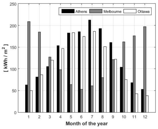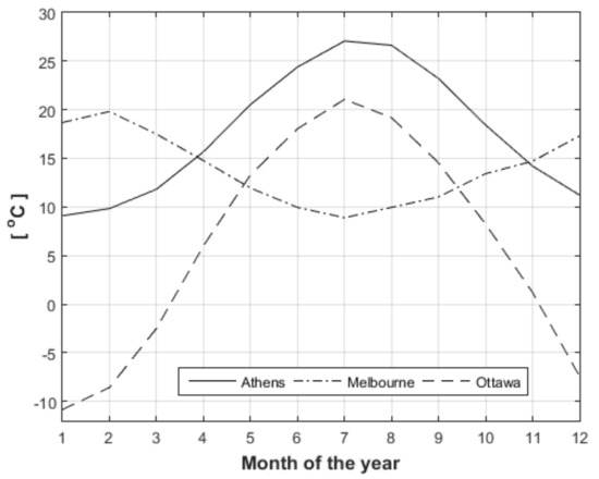 In the current study, a PVT-based SAGSHP system is evaluated energetically for three cities with distinctive climates. The three cities are: Athens, Greece (37.54° N, 23.44° E), with a Mediterranean climate Csa; Melbourne, Australia (37.40° S, 144.50° E), with a temperate oceanic climate Cfb; and Ottawa, ON, Canada (43.40° N, 79.19° W), with a warm summer continental climate Dfb (Köppen–Geiger [42,43]). For all three cities, the SAGSHP system was installed to provide thermal energy for a low-rise single-family dwelling for space heating and domestic hot water (DHW). Figure 1 and Figure 2 show the mean ambient db air temperature and the monthly global horizontal solar energy, respectively, for all locations. Data from Meteonorm for the typical meteorological year (TMY) were utilized for these figures.