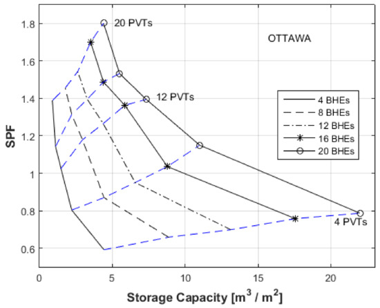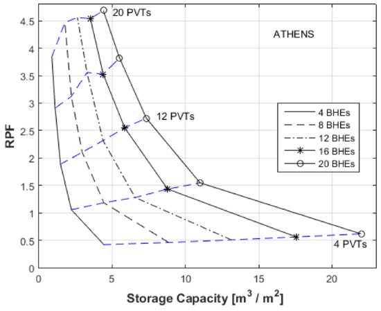 In Figure 6, the RPF for Ottawa is illustrated as a function of the storage capacity. The largest value for Ottawa is recorded as 2.1 for the largest system and the lowest as 0.25 for the smallest one, respectively. The obtained RPF for Ottawa can be marked as significantly lower than that of Athens (Figure 4), with the main cause being the hard winter (Figure 1). Low temperatures implicitly influence the space heating load and the temperature of the soil, thus, consequently, heat loss from the EEB. The self-sufficiency for Ottawa can be distinguished into three sections: (a) for small EEBs of four and eight BHEs with PVT arrays larger than 12 collectors are required; (b) the case of 12 BHEs, where the system gets RPF larger than 1 from the array of 12 PVTs; and (c) for the larger EEBs of 16 and 20 BHEs, all PVT arrays equal and above 12 collectors are capable of RPF larger than 1.