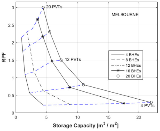 Figure 5 illustrates the RPF for Melbourne for all the investigated scenarios. The obtained RPF for Melbourne varies from about 0.2 to 3 for the smallest to the largest system, respectively. The RPF for Melbourne exhibits similar trends to those described for Athens, the RPF increases as the PVT array and the EEB enlarge. As regards the self-sustainability of the system, this can be obtained with the PVT array having more than eight collectors. The storage capacity for all scenarios with 20 collectors remained lower than 5 m3 m−2, but in this range, the system increases the RPF by about 0.8. In other words, the systems with 20 PVTs can produce 80% of their annual electric energy consumption by installing the largest EEB against the smallest one. The contribution of the storage capacity to the RPF diminishes as the number of collectors reduces.