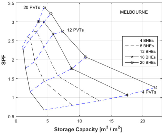 Figure 8 illustrates the SPF for all investigated scenarios of PVTs and BHEs for Melbourne. The SPF for Melbourne was found to vary from about 0.6 to 3.4 for the smallest and the largest systems, accordingly. Overall, the SPF calculated for Melbourne is higher than that for Athens, this is justified by the substantially higher QHP_heat (Table 6) delivered for Melbourne compared to that for Athens (Table 5). The high heating load of Melbourne drives the heating system (heat pump) to deliver more heat, which depletes the stored heat in the EEB and reduces the soil temperature. Consequently, this facilitates the capability of the system to deliver more solar heat and to store this in the ground. Given this, it can be stated that the ability of the system to provide heat is restricted by the demanded heating load: no or low load, the soil temperature stagnates and the solar energy cannot be stored further.