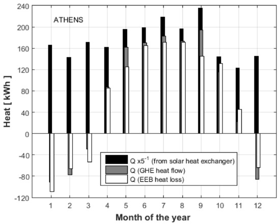 As illustrated in Figure 10, for Athens, the solar heat QSHE is provided to the systems all year long, with the most productive month being September. The solar heat production remains high during the heating season as well due to low soil temperatures, which augments the operation of the PVTs. As regards the solar heat stored in the EEB, this is the positive part of the QGHE and takes place from April to November, with the highest value being September. From December to March, the heat stored in the ground is provided as additional heat to the solar on the heat pump, this is the negative part of the QGHE. Moreover, the stored heat in the ground is utilized disproportionally during the heating season, from the about 1000 kWh transferred into the ground during the charging period, only about 200 kWh is used during the heating period. This discrepancy is due to two major causes: the EEB suffers from heat loss QGHE_loss, which follows the storage production pattern and is proportional to the soil temperature of the EEB; and secondly, the offered solar heat QSHE is substantial during winter, thus it can be used directly with no need to extract the stored amount. It is worth noting that, during the heating season, the EEB receives heat from the adjacent soil mass (negative loss), which contributes to the available heat.