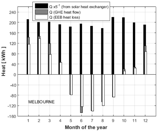 Figure 11 shows the heat flow across the EEB for Melbourne and for the systems of 12 PVTs installed with 12 BHEs. Similarly to the results for Athens, the solar heat production can be considered all year round for Melbourne. The most productive months are September and October, which are spring months for Melbourne. The high levels of solar heat (Table 6) production all year round are caused by the high heat demand, which discharges the EEB and, by that, reduces the soil temperature. With a low temperature regime in the soil, the solar heat production augments (more frequently reaching the ΔT of 6 K between the PVTs and the soil). The storage period of the solar heat for Melbourne can be seen to be from October until April; similarly, the discharging period (heating season) extends from May to September. The stored solar heat (+QGHE) and the heat discharged from the EEB (−QGHE) are balanced, with about 500 kWh of heat to be stored and the same amount to be discharged. The heat loss of the EEB follows the pattern of the heat from the GHE, with positive and negative values to be balanced annually.