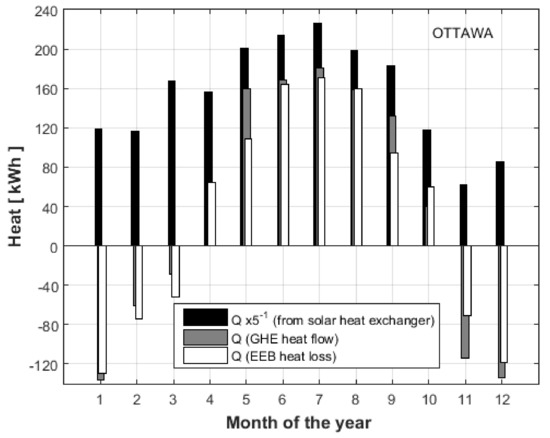 Ottawa has the coldest climate among the study locations (Figure 1 and Figure 2). The relative heat flows across the EEB for the system in Ottawa are graphed by Figure 12. The solar heat QSHE is produced throughout the year, by having the highest value in July and significantly lower production during the winter months. The heat storage period is from April to October, and from November to March, the heat is discharged from the EEB. The heat storage is uneven for the heat drug from the EEB, which indicates excessive heat loss during the charging period, which reduces the available heat of the EEB.