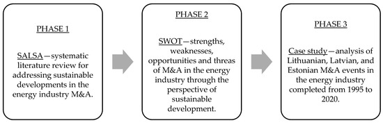The methodological approach employed in this research is presented in Figure 2. The study sought to provide a holistic and comprehensive understanding of developments and trends of M&A in the energy industry through the lens of sustainable development. Therefore, the methodological approach was constructed of three phases. Firstly, the SALSA (search, appraisal, synthesis, analysis) methodology was used for a systematic literature review (Phase 1) in order to perform a comprehensive SWOT analysis (Phase 2). Through Phases 1–2, we questioned how energy M&A are contributing to sustainable development on the one hand and reflecting sustainable developments on the other hand. Secondly, Phase 3 took a sample of energy M&A events conducted in the Baltic states (Lithuania, Latvia, and Estonia) from 1995 to 2020 and sought to view market developments through the lens of sustainable development.