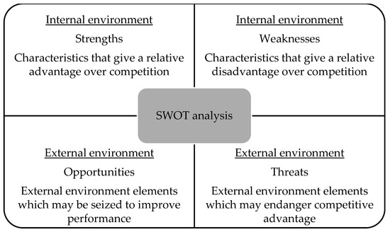 Introduced in the 1950s at Harvard Business School and methodologically established in 1963 at a Harvard business policy conference, the SWOT (strengths, weaknesses, opportunities, and threats) methodology has a history of use over six decades. Within the focus of the current research, the SWOT analysis (Figure 4) approaches M&A in the energy industry through the perspective of sustainable development. Specifically, strengths and weaknesses arising from the internal environment are analyses, whereas opportunities and threats from the external environment are further added to the research interests. With SWOT becoming a mainstream framework in strategic management in the 1990s, this analysis has been used in many fields (e.g., education, politics, economics, environment, agriculture, legal, etc.). As Benzaghta et al. [21] acknowledges, SWOT analysis has become a key tool used by businesses for strategic planning. In addition to that, SWOT is commonly used to assess the internal and external environments of organizations during indetermination [22]. Dyson [23] defines SWOT as a flexible methodology which may be used with various newer techniques and approaches, stating that the SWOT methodology may be used to assess the current and potential standings of a particular matter and predict how it is set to perform in the future. Similarly, Vlados [24] argues that while initially SWOT was applied in the private business field, over time application of this methodology has expanded beyond its origins and currently it may be used in energy, development policies, public healthcare, water resources management, and rural development management, etc.