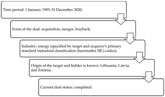 Arslan and Er [25] acknowledge SWOT as having the capacity to assess strengths and opportunities for a specific objective. On the other side of the scale are threats and weaknesses that when timely determined may be properly avoided and minimized in order to achieve the objective. Sharma and Sehrawat [26] support SWOT as being able to establish weights of internal (strengths and weaknesses) and external (opportunities and threats). The results of SWOT analysis may help practitioners and strategists to identify strengths, weaknesses, opportunities, and threats. Similarly to the approach proposed by Falcone [27], when carrying out the SWOT analysis we based it on a literature review of M&A and sustainable development. Considering the motivation of the current research includes analysis of M&A in the energy industry, we further analyzed a sample of Lithuanian, Latvian, and Estonian M&A events that were completed from 1995 to 2020. The DataStream 5.1 database by Thomson Reuters was employed to select a sample of Lithuanian, Latvian, and Estonian energy companies that were involved either as a target or acquirer from 1995 to 2020. Figure 5 introduces the selection criteria of the M&A data sample used in the research.