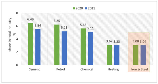 The Polish steel industry occupies a high position among industries in Poland in terms of CO2 emissions—the fifth position after power and heat plants and the refining, cement, and chemical industries (Table 1). The share of the Polish steel industry in the total amount of CO2 produced in 2021 is shown in Figure 1.