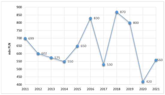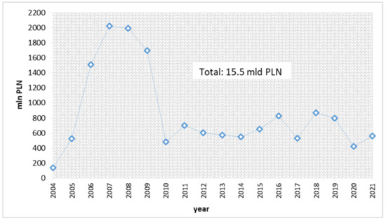 The implementation of environmental restrictions in steel mills was accompanied by an increase in spending on technological investments. In the last decade (2011–2021), the total amount spent on investments was over PLN 7 billion (Figure 4). Annual investment expenditure ranged from PLN 400 to 900 million. A significant decrease in investment expenditure was recorded in the Polish steel industry in 2020, the pandemic period (COVID-19). Investment expenditure in the Polish steel industry, in the cited decade, was lower than in previous years. Going back in time, it was found that between 2004 and 2021, the Polish steel industry spent PLN 15.5 billion on investments. The highest investment spending, by far, was recorded in 2006–2009 (Figure 5).