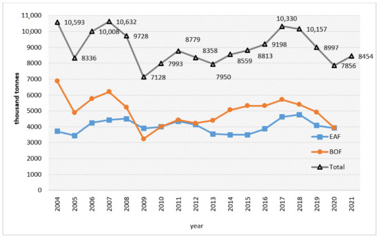 Steel production in Polish steel industry from 2004 to 2021. Total = EAF + BOF. Source: own elaboration based on Reports: Steel production in figures. World Steel Association [69].
