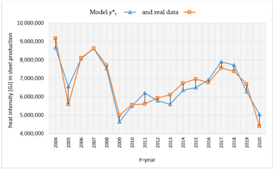 Model: y*t = −5,290,326x1t + 929.276x2t + 64,352.28 for Polish steel industry for T: from 2004 to 2020. Where: Yt—real data: heat intensity in steel production (total) [GJ]. Y*t—heat intensity in steel production (total) [GJ] from model (2). Source: own elaboration.