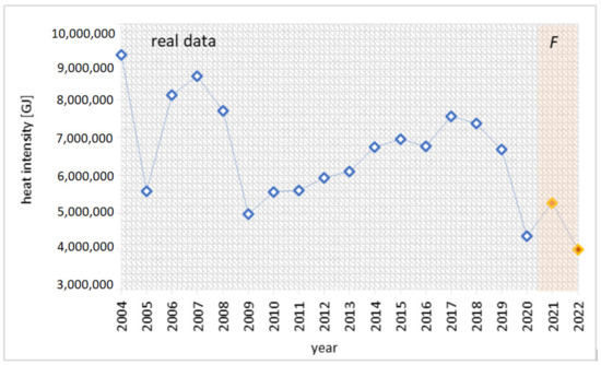 Econometric modelling involves looking for correlations between the heat and energy economy in the steel production process in Poland. Data on the entire sector called the steel industry, which is made up of producers of steel (steel mills) and steel products, were used to describe the energy and heat economy in the steel industry in Poland. The data used to select the econometric model concerned the period from 2004 to 2020 (n = 17, where n is the number of elements in the time series and T is the period from 2004 to 2020 (t-year)). The beginning of the analysis was taken as the year in which the main steel producers in Poland completed their mandatory corrective restructuring to meet the EU viability requirements. Data from 2021 and 2022 (steel production and energy price) were used to forecast changes in heat intensity in the Polish steel industry. The empirical (statistical) data from 2004 to 2020 were used in the econometric model. Data came from reports of Polish reporting units: Statistics Poland, Warsaw (in Polish: Główny Urząd Statystyczny—GUS) and the Polish Steel Association, Katowice (in Polish: Hutnicza Izba Przemysłowo-Handlowa—HIPH). The data categories used to search for optimal model parameters are summarised in Table 3. The authors searched for single-parametric or two-parametric models. The basis for assessing the significance of the models was R2, where R2 is the determining factor.