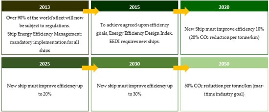 The International Maritime Organization (IMO) is a United Nations (UN) organization whose objective is to increase safe, secure, ecologically sound, efficient, and viable shipping through partnership [16]. The IMO defined the Initial Strategy in April 2018, intending to reduce GHG emissions from shipping by at least 50% by 2050 compared to 2008 [17]. The Initial Strategy’s primary goals are as follows: