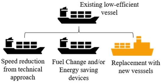 The IMO approved revisions to the International Convention for the Prevention of Pollution from Ships (MARPOL) Annex VI in November 2020, introducing a new metric for existing ships, the Energy Efficiency Existing Ship Index (EEXI) [21]. By 2023, the EEXI will be in effect and “will apply to any boat above 400 GT that comes under MARPOL Annex VI” [21]. The EEXI is effectively seen as an extension of the EEDI, and the “necessary EEXI is practically in agreement with requirements” for new-build ships. The EEXI “determines the standardized CO2 emissions associated with installed engine power, transport capacity, and ship speed” [22], and it “describes CO2 emissions per cargo tonne and mile”. In other terms, the EEXI sets a CO2 emission limit per unit of transportation supply [22]. It’s important to note that the EEXI is a technical (or design) index, not an operational index. As a result, there are no observed values for previous years, and no onboard measurements are necessary. The EEXI, in essence, simply relates to the ship’s design. Figure 3 shows an example allowing multiple options for design improvement according to EEXI. “Below is a brief overview:”