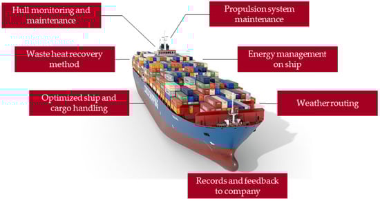 The Ship Energy Efficiency Management Plan (SEEMP) is a management plan for new and existing ships that optimizes fuel efficiency through operational changes. SEEMP is a legal requirement for current ships. The Ship Energy Efficiency Management Plan can be applied in various ways, including improving the vessel’s speed, changing direction to avoid rough weather, hull cleaning in dry dock, and adding heat recovery methods, among others. All these strategies aid in boosting the efficiency of the ship and optimizing its functioning. Figure 4 illustrates the key features of SEEMP.