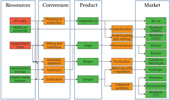 The use of biofuels, hydrogen and natural gas as ship propulsion fuels has been proposed [11,32]. However, biofuels from food plants compete at once with agriculture for soils, potentially causing more difficulties than they solve in the long run. Cellulosic ethanol is also troublesome since it extracts supplements from crop soils [33,34] and will contest with methane and olefins generation for crop misuse in a post-carbon economy [35]. Algae-based biofuels could be deployed in the next ten years, but they must first overcome several unsolved challenges that make their adoption uncertain as a widely available fuel [36]. The European Biofuels Technology Platform defines, first, second and third generation biofuels as follows: (Figure 6):