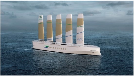 Soft sails mounted on tall spar are a tried-and-true technique used for primary or secondary propulsion [38]. Soft sails are simple to adapt to existing ships or include in new ship designs. The Oceanbird (Figure 7) and the Seagate delta wing sail are two examples.