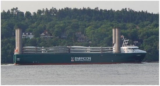Flettner Rotors use the Magnus effect for propulsion, which occurs when wind passes through a pivoting cylinder [46,47,48]. It was first shown on several ships in the 1920s. However, the technique was mainly forgotten until the early 1980s when French Captain Jacques Cousteau and his research team integrated the turbo-sail, a non-rotating fan-driven variant, on their research vessel. In 2010, the German company Enercon tested the 12,800 dwt E-SHIP 1 on board its ship, which has four Flettner rotors powered by the exhaust gases from of the principal turbine generator [49] (Figure 8). Adapting Flettner rotors to tankers and bulkers is being looked into, even though board space use for various ship classes is vital. According to [49], the E-ship 1 with Flettner rotors consumes up to 25% less fuel than similar traditional merchant ships.