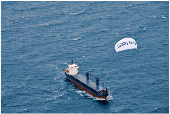 Kite sails are linked to the ship’s bow and perform at high altitudes to take advantage of strong wind speeds, (Figure 9). The kite sail can help shipowners save 10–35% on annual fuel costs [50]. The MS Michael A. was the first container ship that used a kite sail in part [38,45].