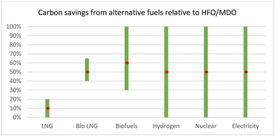 Since shipping accounts for 3% of total worldwide greenhouse gas (GHG) emissions [6,7,8,9,10], severe environmental rules governing oxide of nitrogen (NOx), sulfur oxide (SOx), and carbon dioxide (CO2) emissions are anticipated to drive significant technological advancement in the industry. With regard to this, Liquefied Natural Gas (LNG) can boost performance, while methane slip reduces the benefits [2,11,12]. Other fills and/or innovations such as biofuels, carbon capture and storage, nuclear, and hydrogen have the potential to decarbonize the industry. Still, each has significant economic, resource, and social acceptability constraints [2]. In addition, many efficiency upgrades (such as hull design, propeller design, cleaning, etc.) can reduce fuel usage. Numerous issues/problems must undoubtedly be addressed to accomplish the carbon depletion of the shipping industry. As a result, “there is no single route,” and a comprehensive reaction is needed from several industry segments. Furthermore, shipping demand is expected to increase over the next three decades [9]. To understand current industry trends, Shell and Deloitte performed a market survey [13]. In their study, more than 90% of shipping sector respondents said decarbonization was an essential or top priority for their companies. Decarbonization’s importance has “grown greatly over the previous 18 months,” according to 80% of the respondents. Given the sea sector’s 3% contribution to GHG emissions, profound decarbonization will require budgetary motivating forces and approaches at the worldwide and territorial levels. For this, technical and operational are the two primary types of maritime emission and reduction measures [14,15]. According to [15], alternative fuels, ship electrification, and renewable energy sources are all recognized as different ways to decarbonization. At the same time, these ways may be considered to come within the technical measure’s category.